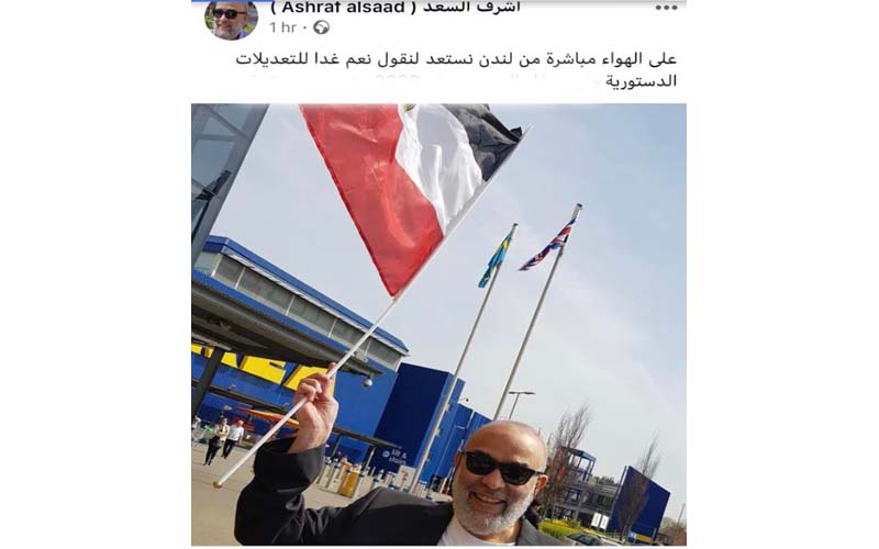 كعادته شخصية متفردة، قام رجل الأعمال أشرف السعدي، المقيم بلندن برفع العلم المصري من أمام السفارة القطرية والتركية بلندن، وهاجم أردوغان وجماعة الإخوان الإرهابية كما علق قائلاً "نعم للتعديلات الدستورية".