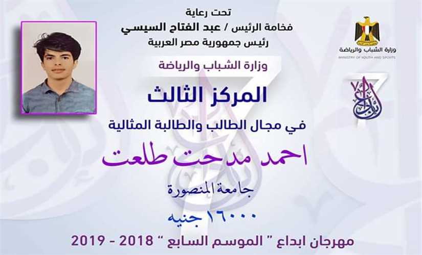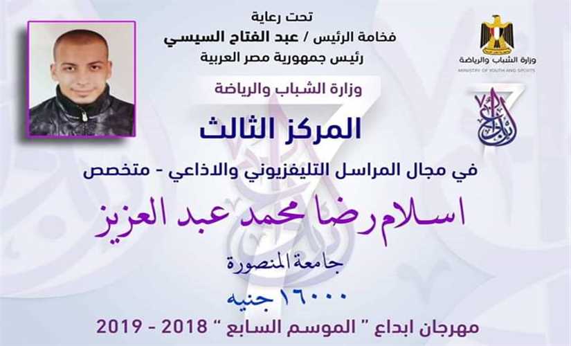 وفاز بالمركز الثالث كلًا من إسلام رضا العشري من كلية الآداب في مجال المراسل التلفزيوني المتخصص، ومحمد أنور ناصف من كلية الآداب في مجال الشعر الغنائي، وأحمد مدحت من كلية الصيدلة في مجال الطالب المثالي.