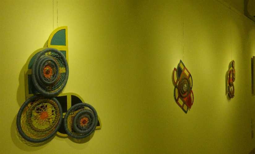 ضم معرض "إبداعات نسجية" للفنان محمد مصطفى 11عملًا نسجيًا، مستخدمًا فيها خامات الخيط النير"صيادي" أبيض اللون متنوع في السُّمْك ، وبعض من عصا أوراق الشجر، والخيش"