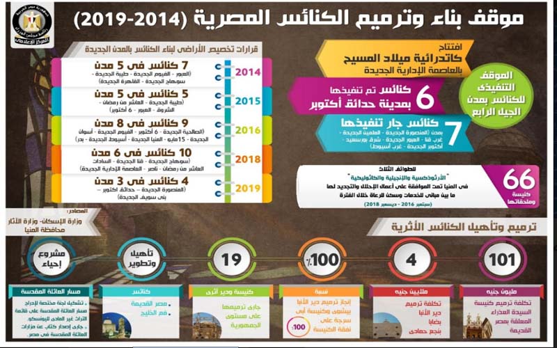 أما فيما يتعلق بموقف بناء وترميم الكنائس المصرية خلال الفترة من 2014حتى 2019، وتأكيدًا لما صرح به السيد الرئيس عبد الفتاح السيسي أثناء افتتاحه لكاتدرائية ميلاد المسيح بالعاصمة الإدارية "نبني ١٤ مدينة جديدة تضم مساجد وكنائس"، فقد كشف الإنفوجراف، عن الموقف التنفيذي للكنائس بمدن الجيل الرابع والتي شملت افتتاح كاتدرائية ميلاد المسيح بالعاصمة الإدارية الجديدة، وتنفيذ 6 كنائس بمدينة حدائق أكتوبر، فضلًا على 7 كنائس جار تنفيذها بكل من مدن (المنصورة الجديدة- العلمين الجديدة- غرب قنا- العبور الجديدة- شرق بورسعيد- أكتوبر الجديدة- غرب أسيوط)، وكذا ٦٦ كنيسة وملحقاتها للطوائف الثلاث "الأرثوذكسية والإنجيلية والكاثوليكية" في المنيا تمت الموافقة على أعمال الإحلال والتجديد لها ما بين مباني للخدمات وسكن للرعاة خلال الفترة (سبتمبر 2016 - ديسمبر 2018).