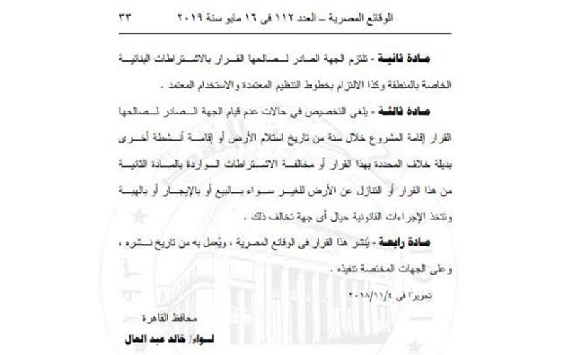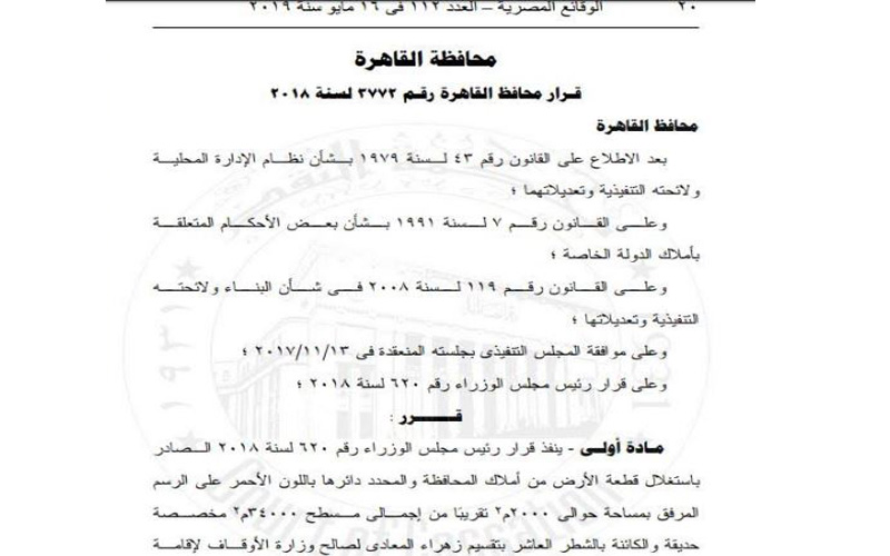 القرارات حملت رقم 3772 لسنة 2018 من محافظ القاهرة وذلك بعد موافقة المجلس التنفيذي للمحافظة في 13/11/2017 وموافقة رئيس الوزراء رقم 620 لسنة 2018 تم الموافقة على تخصيص 2000 متر لوزارة الأوقاف لبناء ضمن 34000 متر مخصصة كحديقة بمنطقة زهراء المعادي، والقرار أشار إلى أنه في حال عدم التزام وزارة الأوقاف ببناء المسجد خلال سنة من تاريخه يلغى كما انه لا يحق للوزارة تغيير نشاط الأرض المخصصة كمسجد أو التنازل عنها لصالح الغير وان القرار يعمل به من تاريخ نشره.