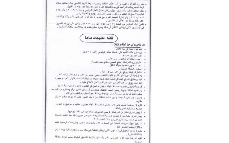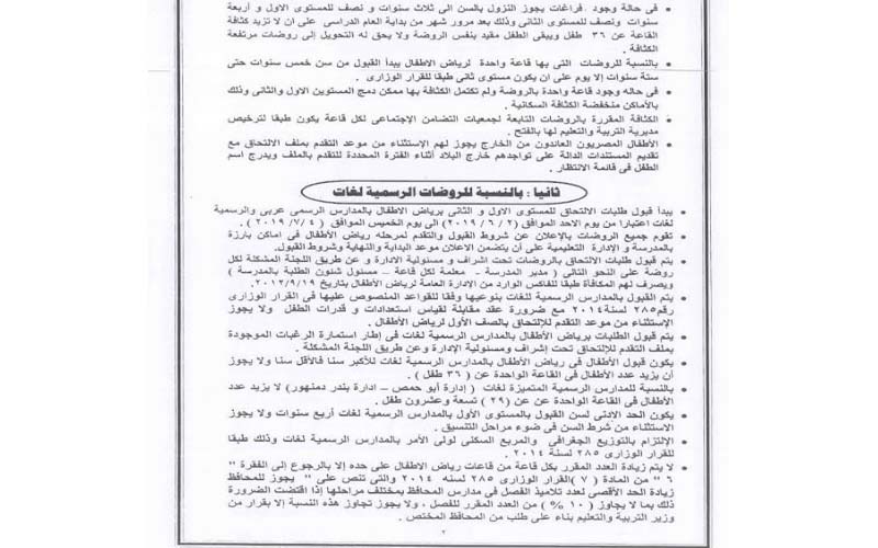 ووجه وكيل الوزارة بقيام جميع الروضات بالإعلان عن شروط القبول والتقدم لمرحلة رياض الأطفال بأماكن بارزة بالمدارس والإدارات التعليمية على أن يتضمن الإعلان موعد البداية والنهاية وشروط القبول.