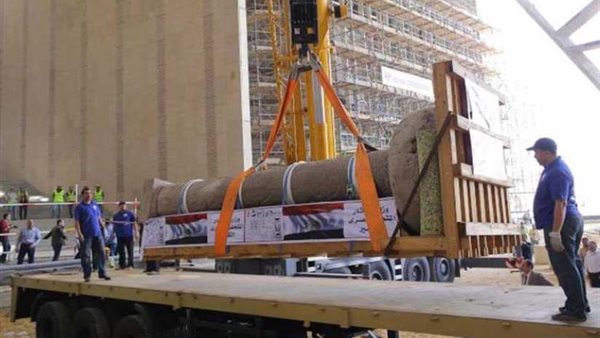 تثبيت عمود الملك "مرنبتاح" بالبهو العظيم بالمتحف المصري الكبير