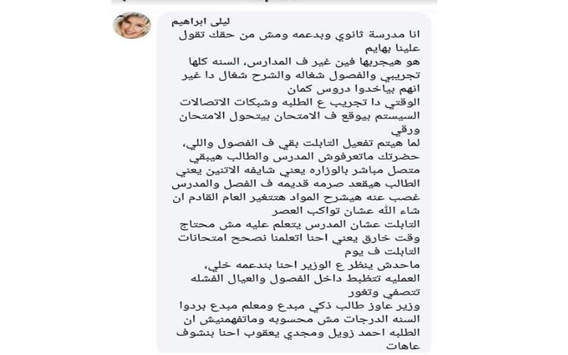 وفي غضون ذلك، قامت مدرسة ثانوي تدعى ليلى إبراهيم بكتابة منشور مطول على صفحتها بـ"فيس بوك" تدعم نظام الامتحان بـ"التابلت".