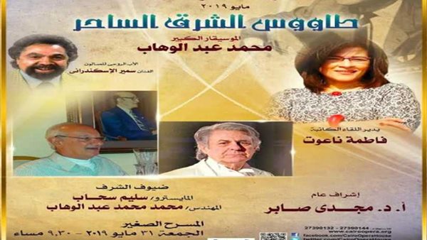 تستضيف دار الأوبرا المصرية "صالون فاطمة ناعوت شهر مايو"، وذلك في المسرح الصغير يوم الجمعة ٣١ مايو في تمام التاسعة مساءً، حيث يحمل عنوان "طاووس الشرق الساحر"، وهو اللقب الذي أطلقته ناعوت على الموسيقار العظيم محمد عبدالوهاب.