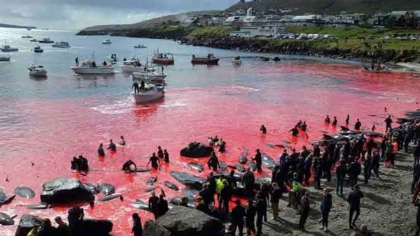 الماء الأزرق يتحول كل عام في البحر إلى دماء حمراء جراء قيام صيادين بذبح عشرات الحيتان بحثًا عن اللحوم كجزء من تقاليد عمرها قرن من الزمان.