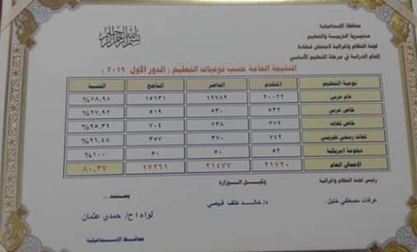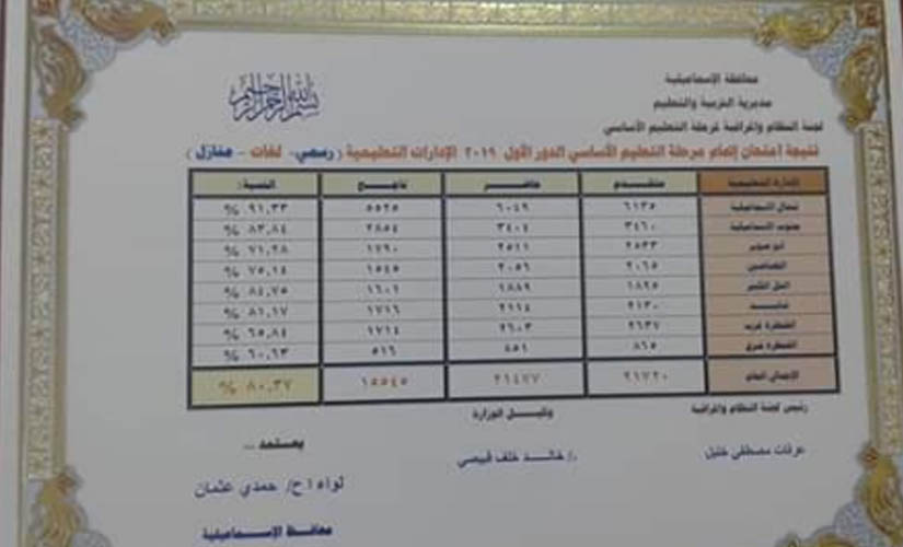 وقال الدكتور خالد خلف قبيصي مدير مديرية التربية والتعليم بالإسماعيلية، إن عدد المتقدمين بلغ 21720 طالبا وطالبة نجح منهم 17261 واحتلت إدارة شمال الإسماعيلية المرتبة الأولى من بين الإدارات الثمانية بنسبة نجاح بلغت 91% فيما احتلت اللغة الإنجليزية المرتبة الأولى بين المواد الدراسية المختلفة بنسبة 95.2 %