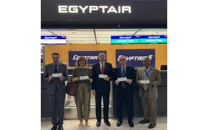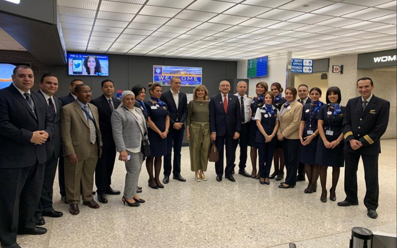 وكان في استقبال الطائرة وفد رفيع المستوى ضم سفير مصر لدى الولايات المتحدة الأمريكية السفير ياسر رضا وقرينته، وعدد من مسؤولي سلطات الطيران المدني بمطار واشنطن دالاس الدولي وفريق عمل الشركة متمثلا في داليا المراغي مدير المكتب وعمر عبد ربه رئيس المحطة.