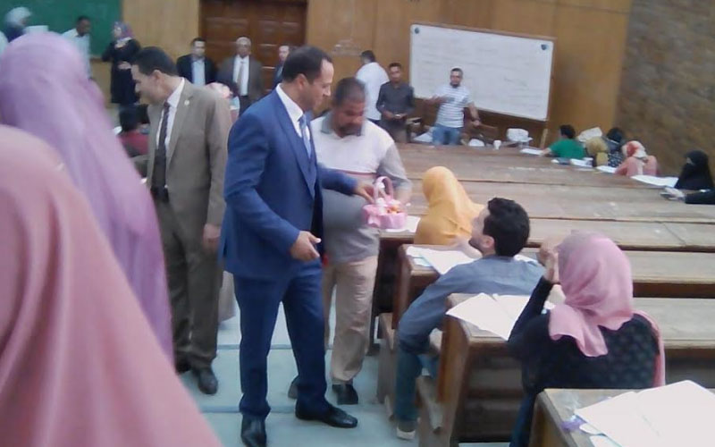 رئيس جامعة دمنهور يوزع الشيكولاتة على الطلاب أثناء الامتحانات بكلية الطب البيطري