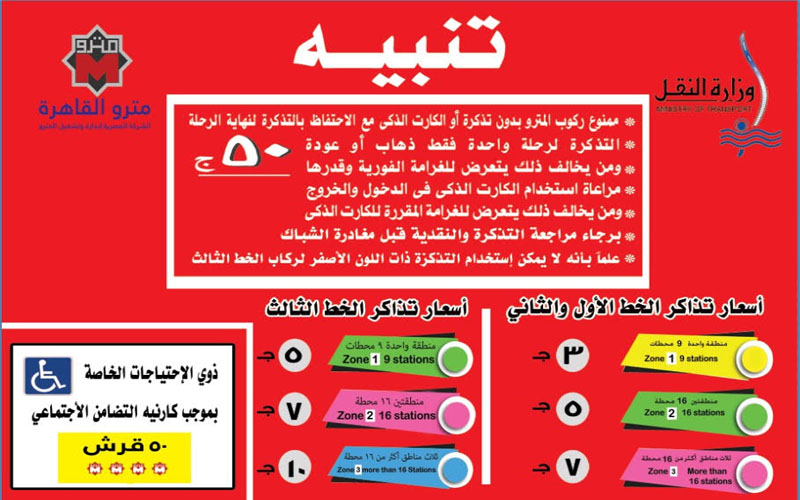 موضحاً أن هذه اللافتات والخرائط متواجدة بجميع محطات الخطوط الثلاثة موضح بها المناطق المختلفة للمحطات وذلك تيسيرا وتسهيلا على جميع ركاب المترو لمعرفة سعر التذكرة بفئاتها المختلفا وأيضاً أسعار الاشتراكات بفئاتها المختلفة مع ثبات سعر تذكرة ذوي الاحتياجات الخاصة بـ٥٠ قرشا مع عدم المساس بأسعار اشتراكات الطلبا وذوي الاحتياجات الخاصة وكبار السن.