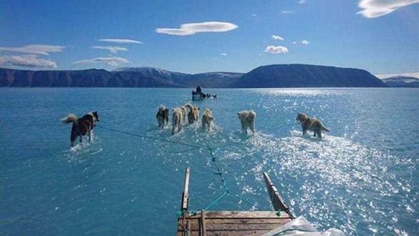 وحسبما ذكر موقع "سكاى نيوز" عربية، فقد ألتقط الباحث الدنمركي ستيفين أم سولين صورة لكلاب تجر مزلجة جليدية لكن ليس على الجليد، حيث تغوص أرجلها في المياه في مضيق بريدنينغ شمال غرب جزيرة جرينلاند المتجمدة، أو التي كانت كذلك قبل أيام.