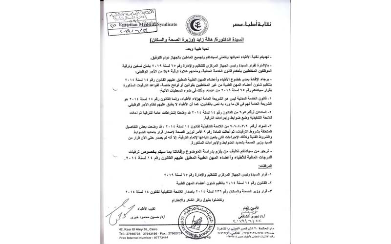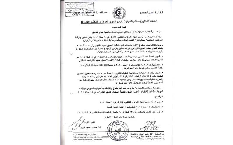 وطالبت النقابة بالإفادة بمدى خضوع الأطباء، وأعضاء المهن الطبية المطبق عليهم القانون رقم 14 لسنة 2014 بتنظيم شؤون أعضاء المهن الطبية من غير المخاطبين بقوانين أو لوائح خاصة، لقواعد الترقيات المذكورة بقرار منكم رقم 65 لسنة 2019 من عدمه، وذلك في ضوء المعطيات الآتية: