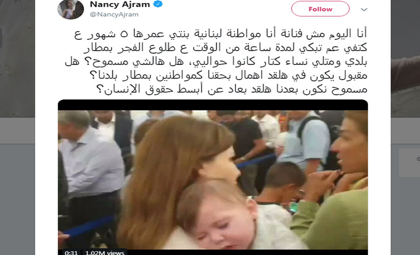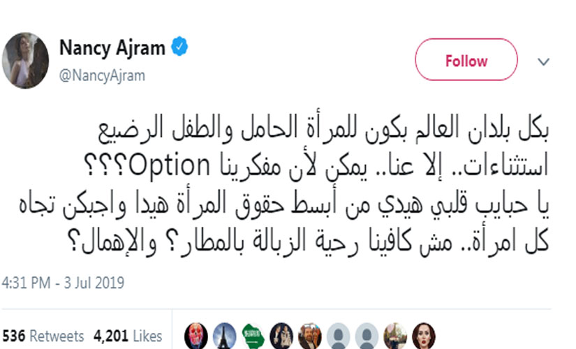 وأضافت نانسي في تغريدة على تويتر، قائلة: "بكل بلدان العالم بكون للمرأة الحامل والطفل الرضيع استثناءات.. إلا عنا.. يمكن لأن مفكرينا Option؟ يا حبايب قلبي هيدي من أبسط حقوق المرأة هيدا واجبكن تجاه كل امرأة.. مش كافينا رحية الزبالة بالمطار؟ والإهمال؟.. ما عندكن ولاد أو ما بتحسوا بولاد الناس؟ راضيين بكل أزماتنا بكل الأوضاع اللي فارضينا علينا بس لما توصل لولادنا وأطفالنا.. لهون وبس.. عيب عليكن".