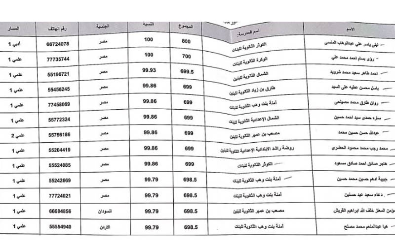 وأوضح المستشار العمالي بالدوحة هشام كامل، أنه تم التواصل مع أولياء أمور كل من الأولى على القسم الأدبي الطالب ليلى ياسر المنسي، وحصلت على نسبة ١٠٠%، أما الطالبة روئ بسام فجاءت الأولى على القسم العلمي، وحصلت على نسبة ١٠٠%.