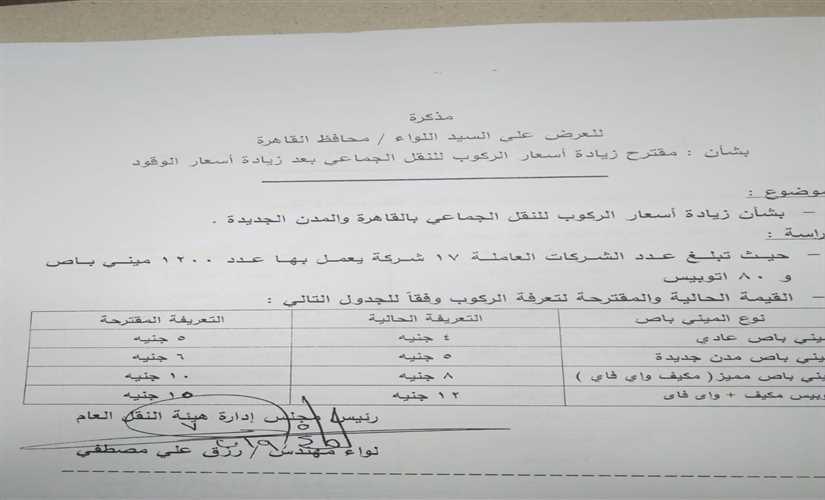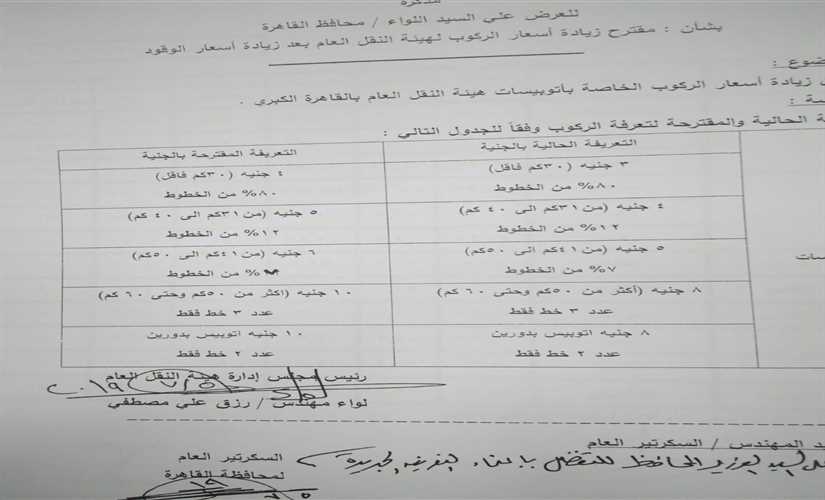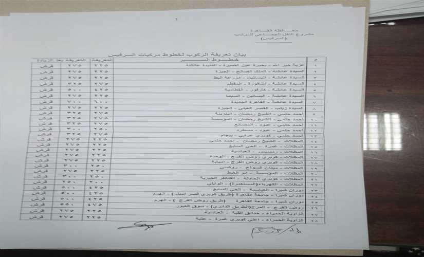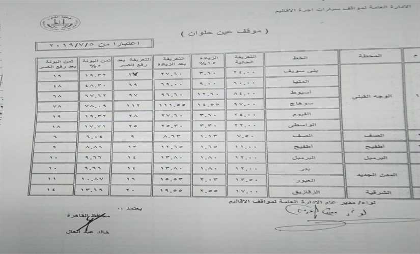 اعتمد محافظ القاهرة التعريفة الجديدة لكافة وسائل النقل العاملة على خطوط القاهرة، وكذلك، مواقف المحافظات.