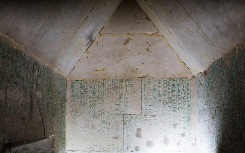 وللهرم مدخلين الاول في الناحية الشمالية على ارتفاع 12 م، يؤدي إلى ممر هابط بطول 79.5، منها إلى صالة عرضية ذات سقف جمالوني ومنها الي ممر غير منتظم يؤدي الجهة اليمنى منه إلى المدخل الغربي للهرم. اما الجهة اليسري تؤدي الي غرفه الدفن الغير مكتملة السقف والتي يوجد بها دعامات خشبية من خشب الأرز المستورد من لبنان