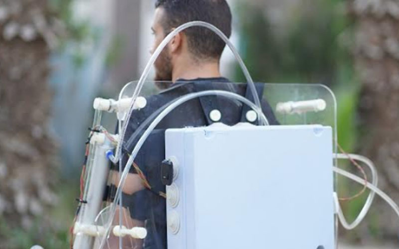 ابتكر مجموعة من طلاب كلية هندسة المطرية، جامعة حلوان، ملابس "بدلة" تعمل بنظام ضغط الهواء وتقوم برفع الأوزان، مما يقلل من العبء الملقى على كاهل العمال، فيمكنهم من زيادة معدل الإنتاج والحماية من المخاطر التي يتعرضون لها في حال رفع الأوزان الثقيلة.