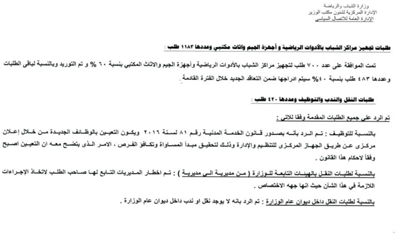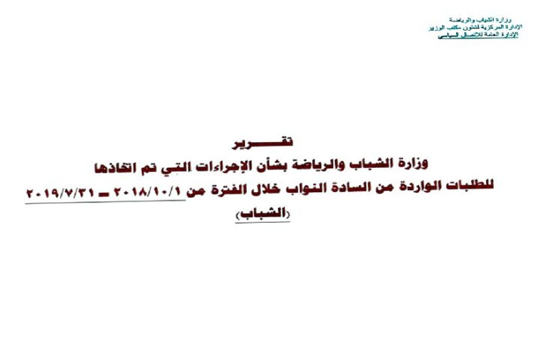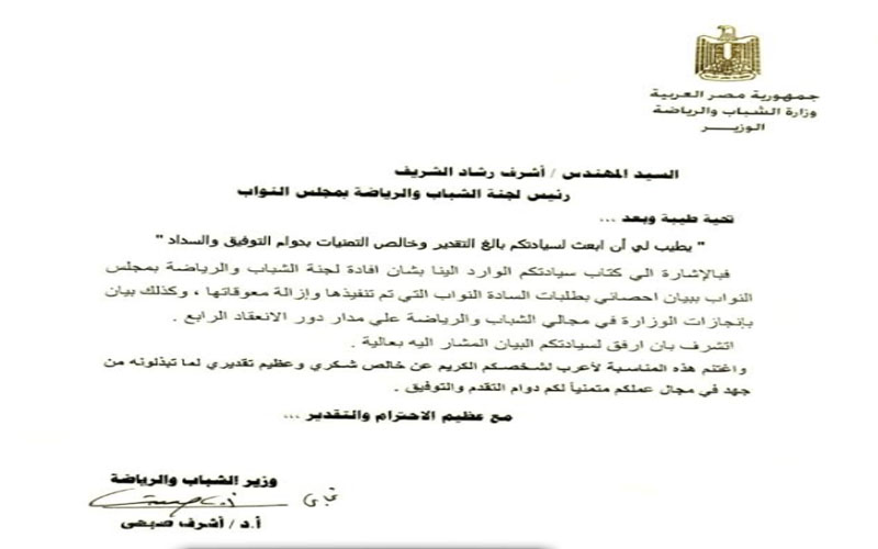 تسلم المهندس أشرف رشاد الشريف رئيس لجنة الشباب والرياضة، تقريرًا رسميًا من وزارة الشباب والرياضة بشأن ما تم تنفيذه من مطالب السادة النواب بانتهاء دور الانعقاد الرابع. حيث بلغت مطالب النواب ما يقرب من 5355 طلبا، وتم تنفيذ 4261 بنسبة 79٪ وباقي الطلبات سيتم دراستها للرد من جانب الوزارة للرد عليها.