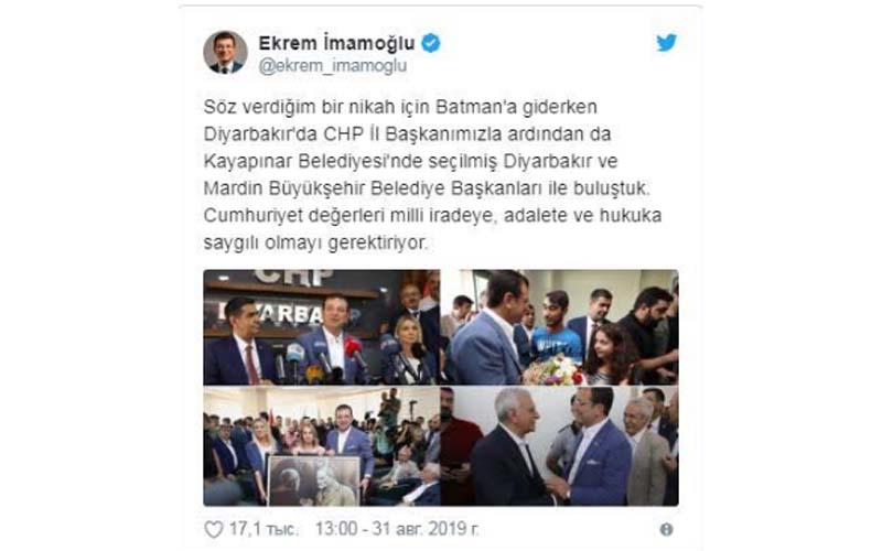 وقال إمام أوغلو، الذي وصل اليوم إلى مدينة ديار بكر: "يجب علينا الوقوف ضد الظلم، وعدم الشرعية بغض النظر عن الطرف المتضرر".