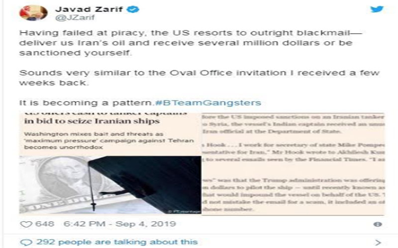 وكتب ظريف: "بعد أن فشلت في القرصنة، تلجأ الولايات المتحدة إلى الابتزاز الصريح.. تسليمنا نفط إيران والحصول على عدة ملايين من الدولارات أو معاقبتك".