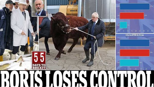 قام رئيس الوزراء البريطاني بوريس جونسون بزيارة، الجمعة، إلى مزرعة بمدينة درانفورد الأسكتلندية، عندما أراد أن يجر ثورا ضخما، لكن الحيوان الهائج استعصى عليه، فلجأ إلى رجال الشرطة لمساعدته. مشهد اعتبره متابعون أقرب إلى ما يواجهه جونسون الذي فقد سيطرته مبكرا على الأمور فيما يتعلق بإجراءات الخروج من الاتحاد الأوروبي وفقا لما أوردته صحيفة "ديلى ميل" البريطانية .