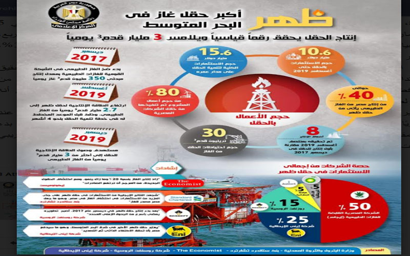 وعلى صعيد الاكتشافات التي حققها قطاع البترول، فقد جاء في الإنفوجراف، أن "حقل ظهر" يعد أكبر حقل للغاز تم اكتشافه في البحر المتوسط، والذي يحقق رقمًا قياسيًا في إنتاجه يلامس 3 مليارات قدم مكعب يوميًا، حيث بدأ الحقل في ضخ الغاز الطبيعي في الشبكة القومية للغازات الطبيعية في ديسمبر 2017، بمعدل إنتاج مبدئي 350 مليون قدم مكعب غاز يوميًا، أما في أغسطس 2019 فقد ارتفعت الطاقة الإنتاجية لحقل ظهر إلى 2.7 مليار قدم مكعب يوميًا من الغاز الطبيعي وذلك قبل الموعد المخطط له في خطة تنمية الحقل بنحو 4 أشهر، أما في ديسمبر 2019 فمن المستهدف وصول الطاقة الإنتاجية للحقل إلى أكثر من 3 مليارات قدم مكعب يوميًا من الغاز الطبيعي.