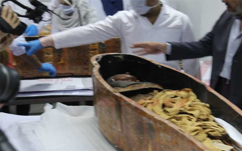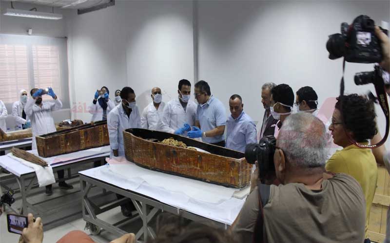 وبعد فك التغليف تم نقل المومياء الخاصة بسنچم إلى معمل الترميم لوضعها في كبسولة التعقيم.