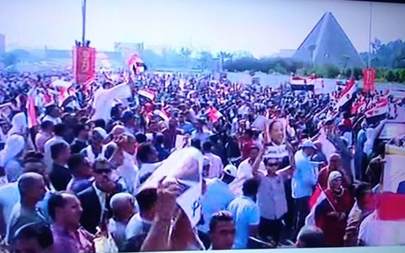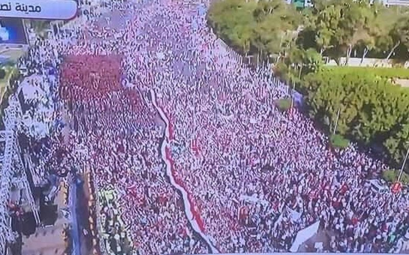 توافد ملايين المصريين إلى المنصة في مدينة نصر تأييداً ومبايعة للرئيس عبدالفتاح السيسي والدولة المصرية في مواجهة دعوات الجماعة الإرهابية ومن يدور في فلكها لتخريب مصر ونشر الفوضى تنفيذاً لأجندات مغرضة.