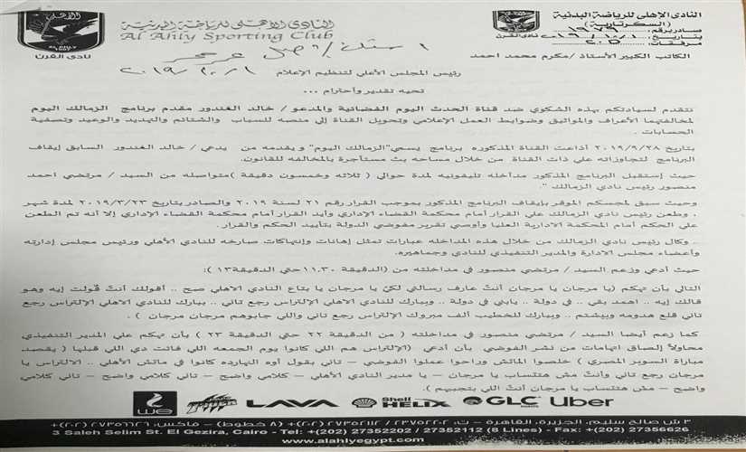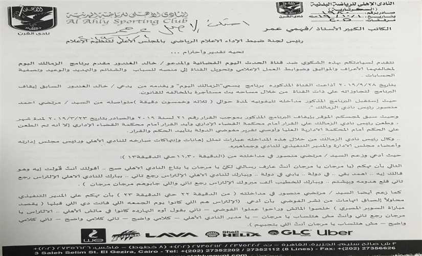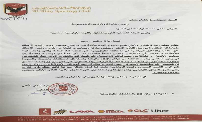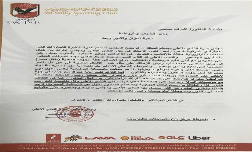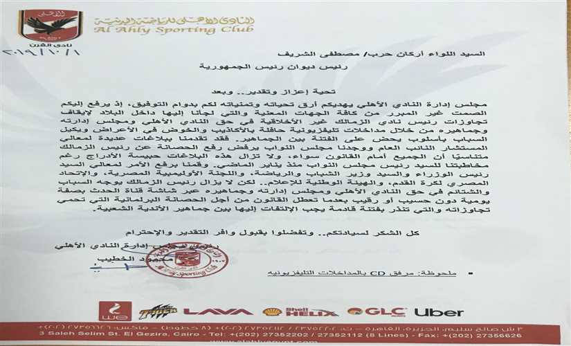 كما أرسل النادي الأهلي خطابًا إلى الهيئة الوطنية للإعلام، وآخر للجنة ضبط أداء الإعلام الرياضي، ومرفق معه تجاوزات رئيس الزمالك على سيديهات وطالب النادي الأهلي كل الجهات المعنية الاضطلاع بمسؤولياتها والتصدي لهذا المتجاوز بالقانون، وألا تقف الحصانة البرلمانية حامية للتجاوزات والخروج عن الآداب العامة والإساءة لكل الأسر المصرية.