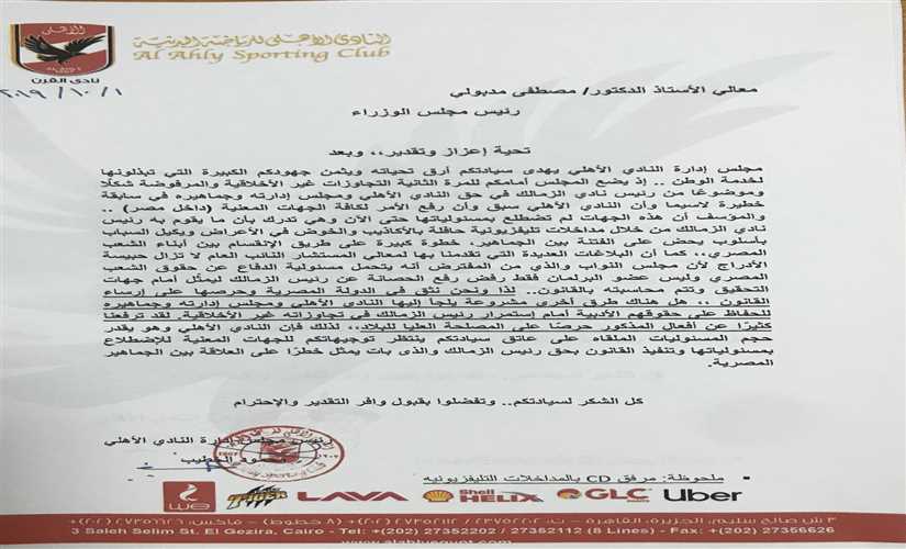 كما أرسل النادي خطابًا إلى معالي رئيس الوزراء يؤكد فيه أنه لجأ إلى جميع الجهات المعنية داخل البلاد، وتساءل النادي الأهلي في خطابه هل هناك طرق مشروعة أخرى بخلاف الطرق القانونية في ظل حالة الصمت غير المبرر تجاه تجاوزات المذكور.