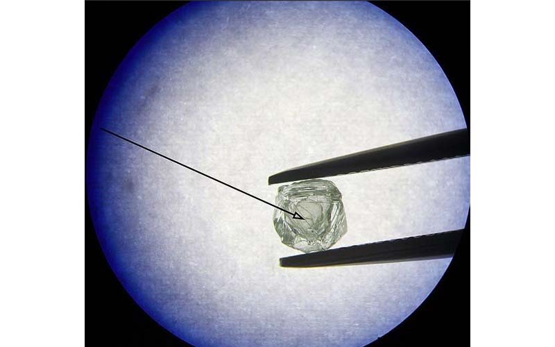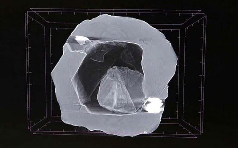 في الداخل، يبلغ وزن الألماس المتداخل الصغير في الفضاء الجوي المغلق الخاص به 0.02 قيراطًا وأبعاد 1.9 × 2.1 × 0.6 ملم، وهي أصغر "خشخيشات" الماس داخل جوهرة أكبر.