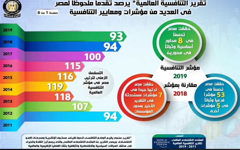 نشر المركز الإعلامي لمجلس الوزراء، إنفوجرافًا سلط من خلاله الضوء على التقدم الملحوظ الذي حققته مصر في العديد من مؤشرات ومعايير التنافسية العالمية، وذلك وفقًا لتقرير التنافسية العالمية الصادر عن المنتدى الاقتصادي العالمي، وهو تقرير سنوي يقيم الوضع التنافسي للدول لقياس مستوى الإنتاجية ومحركات النمو الاقتصادي، ويجمع المنتدى أبرز القادة والخبراء في مختلف المجالات السياسية والاقتصادية والثقافية بشأن القضايا الإقليمية والعالمية. ووفقًا للتقرير فقد احتلت مصر المركز 93 عام 2019، مقارنة بالمركز 94 عام 2018، والمركز 100 عام 2017، والمركز 115 عام 2016، والمركز 116 عام 2015, والمركز 119 عام 2014, والمركز 118 عام 2013, والمركز 107 عام 2012, والمركز 94 عام 2011.