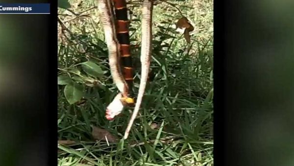 نشرت موظفة أمريكية بجامعة فلوريدا، تدعى إيفانجلين كامينجز، عبر حسابها على موقع التواصل الإجتماعى "تويتر"، مقطع فيديو، يظهر ألتهام ثعبان مرجاني سامة لثعبان، بينما كان يهاجم دبور الثعبان المعتدى آخر، أثناء تعرضه لهجوم من دبور سترة صفراء.