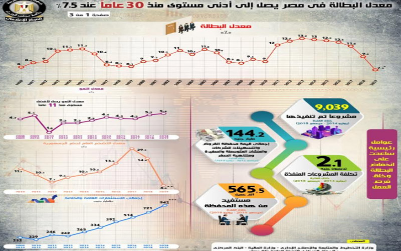 نشر المركز الإعلامي لمجلس الوزراء "إنفوجراف"، سلط من خلاله الضوء على وصول معدل البطالة في مصر لأدنى مستوى منذ 30 عامًا، حيث بلغ 7,5% خلال الربع الثاني من عام 2019، مقارنة بـ 9,9% خلال عام 2018، و8,8% خلال عام 1991، و8% خلال عام 1990.