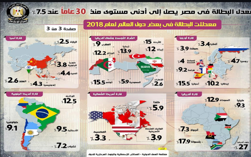 وأبرز "الإنفوجراف" معدلات البطالة في بعض دول العالم لعام 2018، ففي قارة أوروبا سجل معدل البطالة لألمانيا نحو 3,4%، وهولندا نحو 3,9%، والمملكة المتحدة 4%، وفرنسا نحو 9,2%، وإسبانيا نحو 15,5%، وإيطاليا نحو 10,2%، وروسيا 4,7%، أما في منطقة الشرق الأوسط وشمال إفريقيا، فقد سجل معدل البطالة للسعودية نحو 5,9%، والإمارات نحو 2,6%، والأردن نحو 15%، والمغرب نحو 9%، والجزائر نحو 12,2%، وتونس نحو 15,5%، وإيران نحو 12%، وتركيا نحو 13,9%، وفي قارة آسيا سجل معدل البطالة لليابان نحو 2,5%، وكوريا الجنوبية نحو 3,8%، والصين نحو 4,4%، وإندونيسيا نحو 4,3%، والهند نحو 2,6%.