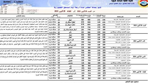 أصدرت الهيئة العامة للأرصاد الجوية التابعة لوزارة الطيران المدني تقرير حالة الطقس لمدة أربعة أيام عن اليوم السبت 26 أكتوبر وحتى الثلاثاء 29 أكتوبر، حيث تبين التنبؤات استمرار حالة عدم استقرار الطقس وتساقط الأمطار على السواحل الشمالية الشرقية وشمال سيناء وبعض مدن القناة فيما تقل حدتها على القاهرة وشمال الصعيد، ليبدأ التحسن غدًا الأحد بالقاهرة والجيزة.