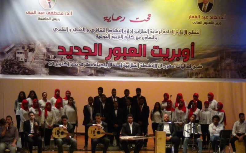 وخلال الاحتفالية التي أقيمت بالقاعة الكبرى بمركز الفنون والآداب والمؤتمرات، قدم طلاب كلية التربية النوعية فقرات غنائية وطنية، شملت أغاني عن روح أكتوبر، وأبن مصر، والحدود، واختتمت بأغنية يا أحلى اسم في الوجود، أعدت الفقرات الغنائية برعاية من الدكتورة زينب محمد أمين عميد كلية التربية النوعية، وإشراف من الدكتور أسامة سمير عياد، رئيس قسم التربية الموسيقية بالكلية، وقيادة كل من الدكتور حسام حسن، والدكتورة راندا محمود، والدكتورة شيماء محمد، والدكتورة دينا عزت بكلية التربية النوعية.