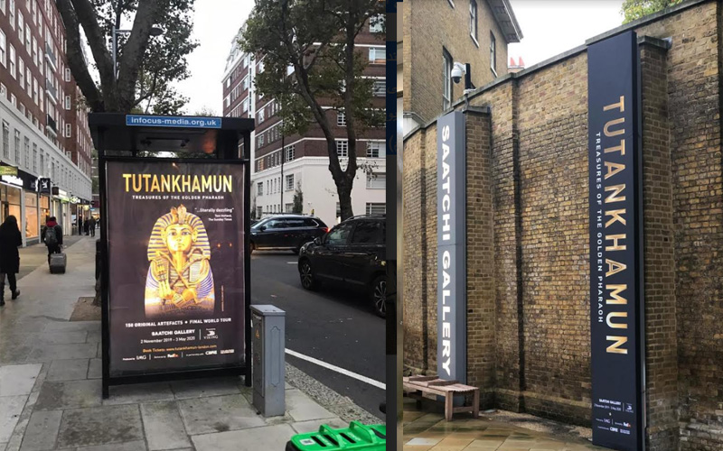 وتحلت الشوارع والميادين الرئيسية ومحطات المترو والقطار في لندن بصور لوجه الملك الشاب وبعض مقتنياته كما تزينت حوائط المحال التجارية والمباني وكبائن الهواتف بلافتات عن الملك الشاب ومعرضه، الذي حل ضيفا على لندن بعد فترة غياب دامت حوالي 12عاما حيث إن آخر معرض لمقتنيات الملك الشاب، جاءت إلى لندن في عام 2007 وفي عام 1972 محققا 1.7 مليون زائر.
