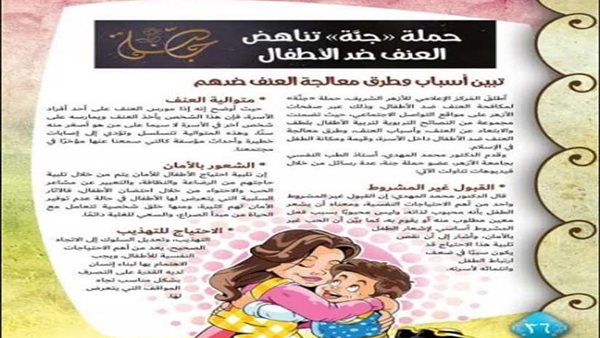 أفردت "مجلة نور" التابعة للمنظمة العالمية لخريجي الأزهر، بابًا جديدًا بعنوان "جنة"، في عددها الشهري بداية من شهر نوفمبر الجاري، وذلك في إطار استراتيجية شاملة وضعها الأزهر الشريف لمناهضة العنف ضد الأطفال.