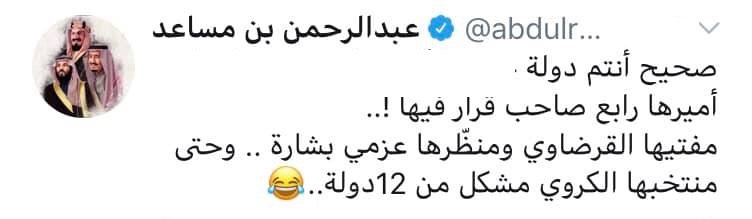 وحاولت شقيقة تميم الرد إلا أن الأمير السعودي بادر بالرد بشكل ساخر، قائلا: "صحيح أنتم دولة أميرها رابع صاحب قرار فيها!.. مفتيها القرضاوي ومنظّرها عزمي بشارة.. وحتى منتخبها الكروي مشكل من 12 دولة".