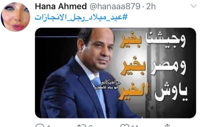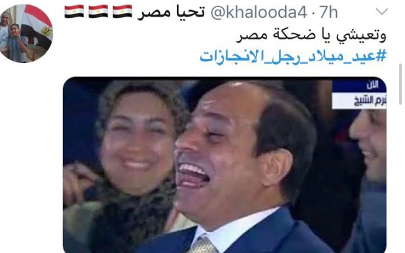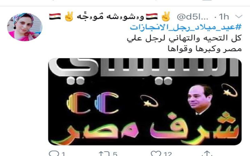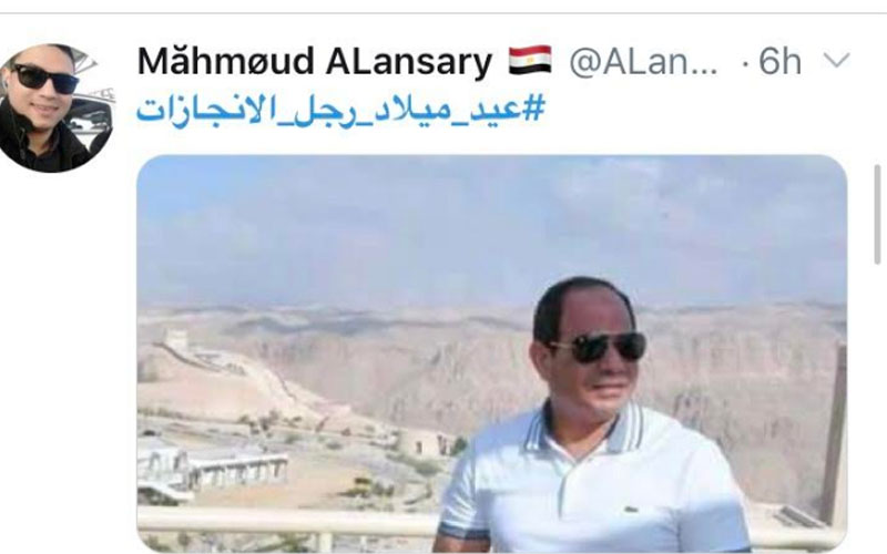 تصدر هاشتاج تهنئه الرئيس عبدالفتاح السيسي رئيس الجمهورية موقع التواصل الاجتماعي "تويتر" بعنوان عيد ميلاده باهشتاج "عيد ميلاد رجل الإنجازات" وانهالت التغريدات المهنئة، وقاموا بتداول الانجازات علي تويتر.