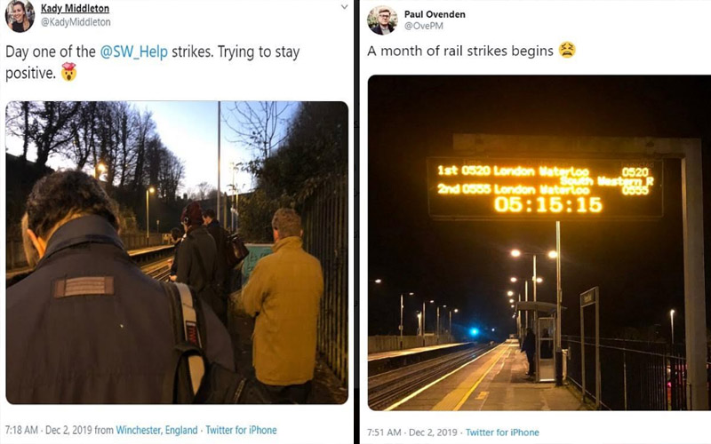 وقالت تغريدة أخرى: في 'اليوم الأول من إضراب سكة حديد "SW"، الساعة 6:30 صباحًا. تأخيرات ضخمة وعدد قليل من القطارات يتم تشغيلها، والازدحام كبير.