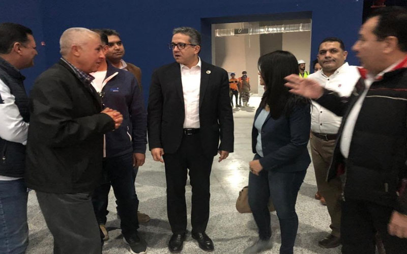 وتفقد د. خالد العناني البهو الرئيسي وقاعة كبار الزوار وقاعة العرض المتحفي، والمنطقة الخارجية التي تحتوي على منطقة المطاعم والكافيتريات والحرف التراثية والبازارات.