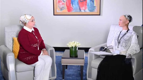 "أحببت قدراتها".. قرينة الرئيس السيسي تلتقي "الروبوت صوفيا"