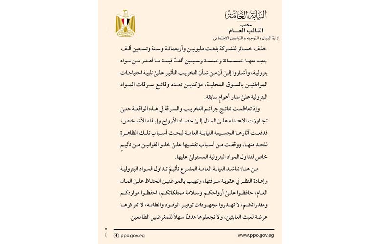 من هنا؛ تناشد النيابة العامة المشرع تأثيمَ تداول المواد البترولية وإعادة النظر في عقوبة سرقتها، وتهيب بالمواطنين الحفاظ على المال العام، حافظوا على أرواحكم وسلامة ممتلكاتكم، احفظوا مواردكم ومقدراتكم، لا تهدروا مجهودات توفير الوقود والطاقة، لا تتركوها عرضة لعبث العابثين، ولا تجعلوها هدفاً سهلاً للمغرضين الطامعين.