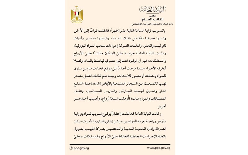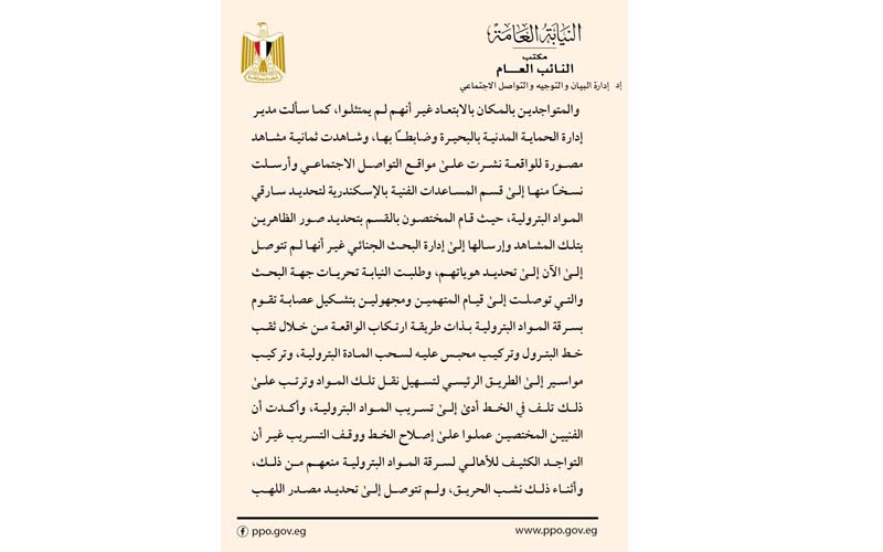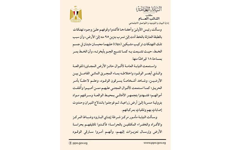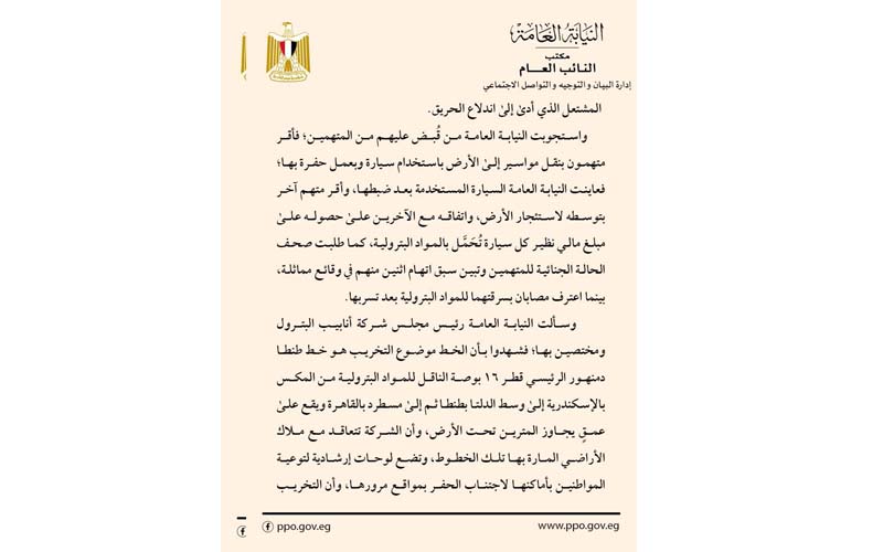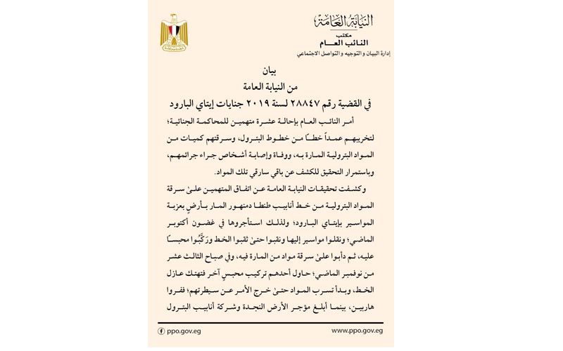 أمر النائب العام بإحالة عشرة متهمين للمحاكمة الجنائية؛ لتخريبهم عمداً خطاً من خطوط البترول، وسرقتهم كميات من المواد البترولية المارة به، ووفاة وإصابة أشخاص جراء جرائمهم، وباستمرار التحقيق للكشف عن باقي سارقي تلك المواد.