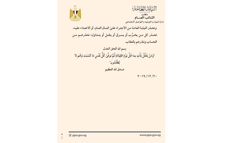 وتحذر النيابة العامة من الاجتراء على المال العام، أو الاعتداء عليه، تحذر كل من يخرَّب أو يسرق أو ينقل أو يتداول؛ تحذرهم من الحساب وتنذرهم بالعقاب.