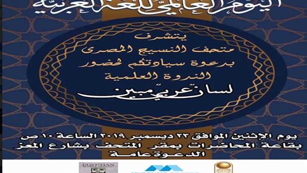 ينظم متحف النسيج المصري في شارع المعز ندوة بعنوان "لسانٌ عربي مبين" في تمام الساعة الحادية عشرة من صباح يوم الاثنين الموافق 23 ديسمبر 2019، وذلك في إطار الاحتفال باليوم العالمي للغة العربية.