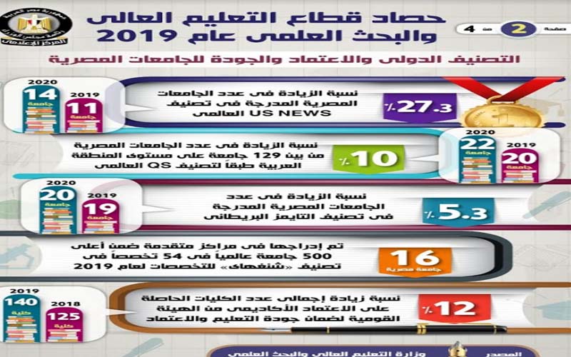 وفيما يتعلق بالتصنيف الدولي والاعتماد والجودة للجامعات المصرية، فقد جاء في الإنفوجراف، أنه تم زيادة عدد الجامعات المصرية المدرجة في تصنيف US NEWS العالمي بنسبة 27.3%، لتصل إلى 14 جامعة عام 2020، مقارنة بـ 11 جامعة عام 2019، وكذلك زيادة عدد الجامعات المصرية من بين 129 جامعة على مستوى المنطقة العربية طبقاً لتصنيفQS العالمي بنسبة 10%، لتصل إلى 22 جامعة عام 2020، مقارنة بـ 20 جامعة عام 2019، فضلاً عن زيادة عدد الجامعات المصرية المدرجة في تصنيف التايمز البريطاني بنسبة 5.3%، لتصل إلى 20 جامعة عام 2020، مقارنة بـ 19 جامعة عام 2019، بالإضافة إلى إدراج 16 جامعة مصرية في مراكز متقدمة ضمن أعلى 500 جامعة عالمياً في 54 تخصصاً في تصنيف "شنغهاي" للتخصصات لعام 2019، في حين زاد عدد الكليات الحاصلة على الاعتماد الأكاديمي من الهيئة القومية لضمان جودة التعليم والاعتماد بنسبة 12%، لتصل إلى 140 كلية عام 2019، مقارنة بـ 125 كلية عام 2018.