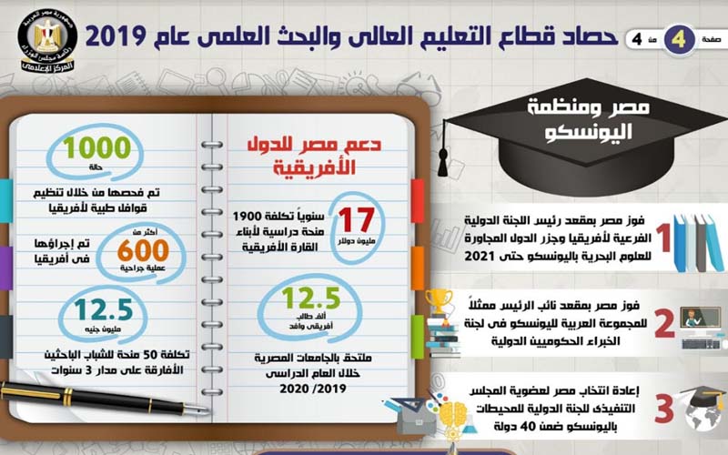 في إطار دعم واهتمام الدولة المصرية المتزايد بقطاع التعليم العالي والبحث العلمي، وزيادة الإنفاق عليه، باعتباره أحد أهم الركائز الأساسية للتقدم، وتحقيق التنمية المستدامة، نشر المركز الإعلامي لمجلس الوزراء، إنفوجرافا سلط من خلاله الضوء على حصاد قطاع التعليم العالي والبحث العلمي خلال عام 2019، والذي تضمن عددا من الإنجازات أبرزها، زيادة حجم الإنفاق السنوي عليه مع التوسع في إنشاء الجامعات والكليات الجديدة، وكذلك زيادة عدد الجامعات المصرية المدرجة في التصنيفات الدولية، فضلاً عن فوز مصر بعدد من المقاعد بمنظمة اليونسكو، وأخيرا استمرار تزايد الدعم المصري للدول الأفريقية في قطاع التعليم.